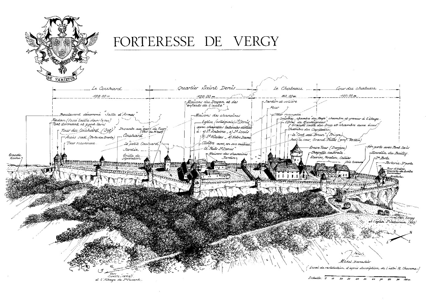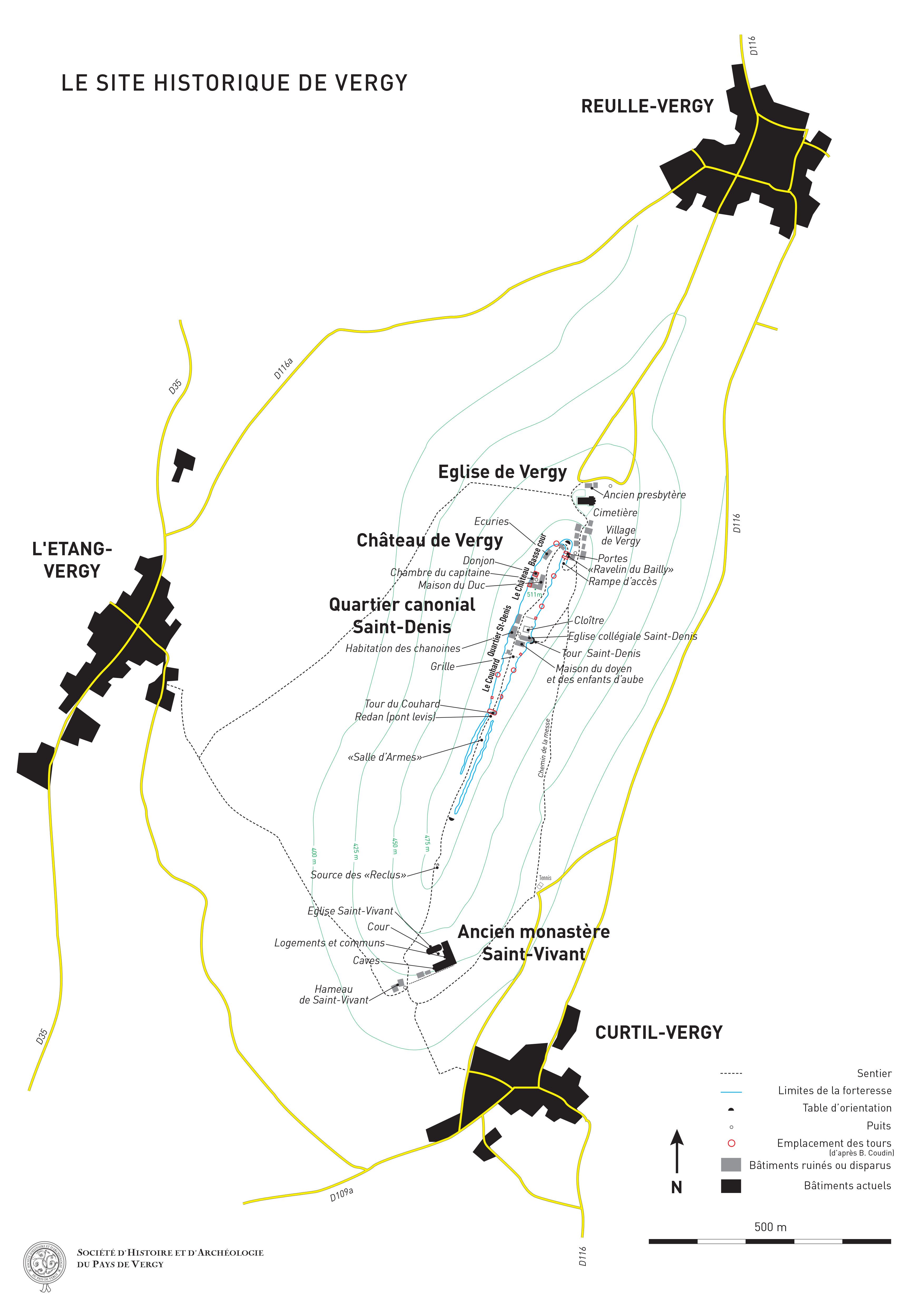 А также любезно предоставленные местной ассоциацией SOCIÉTÉ D'HISTOIRE ET D'ARCHÉOLOGIE DU PAYS DE VERGY схемы холма, вид сверху и художественное изображение старинного замка
