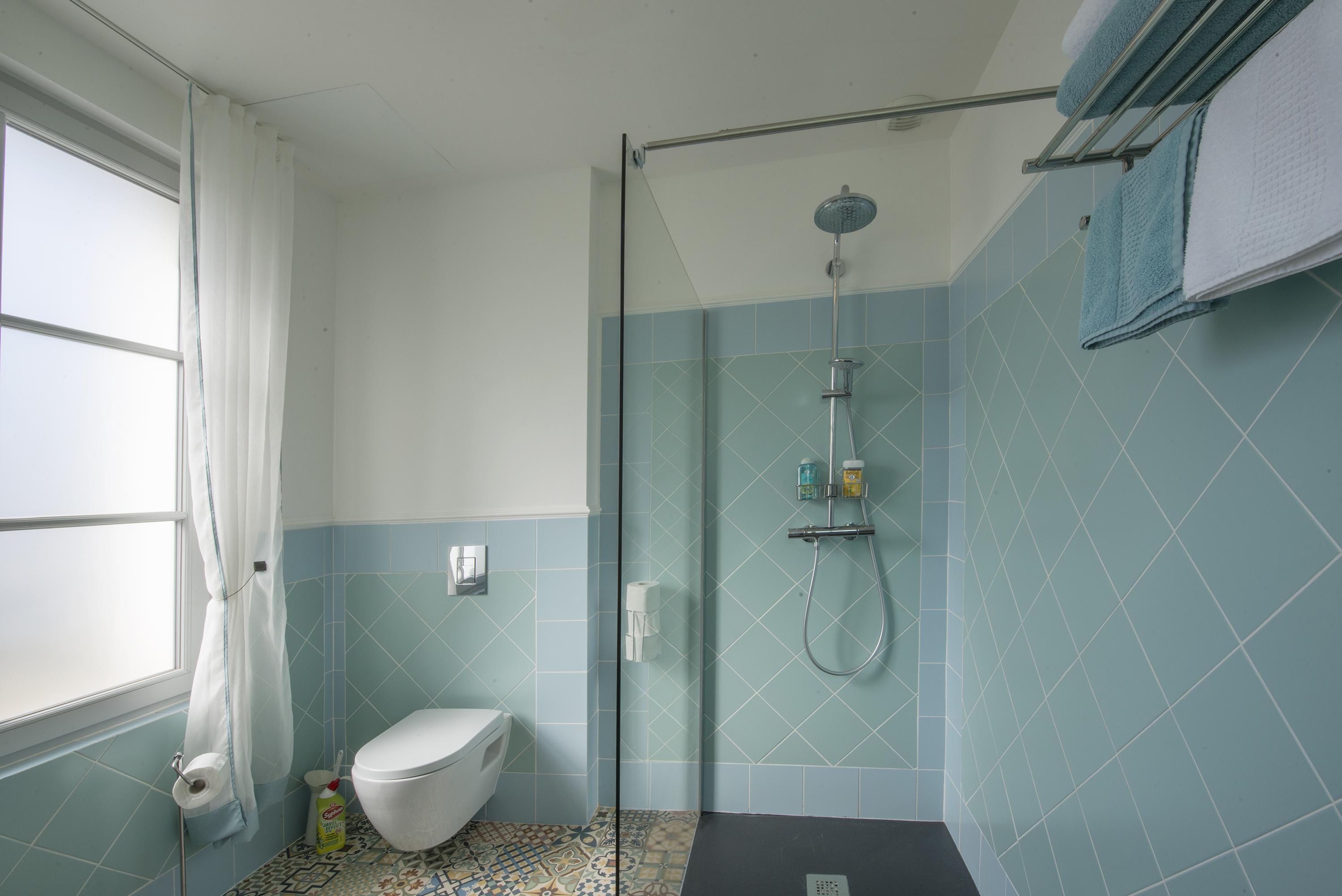 - Шампунь, гель для душа, полотенца и фен в душевой;