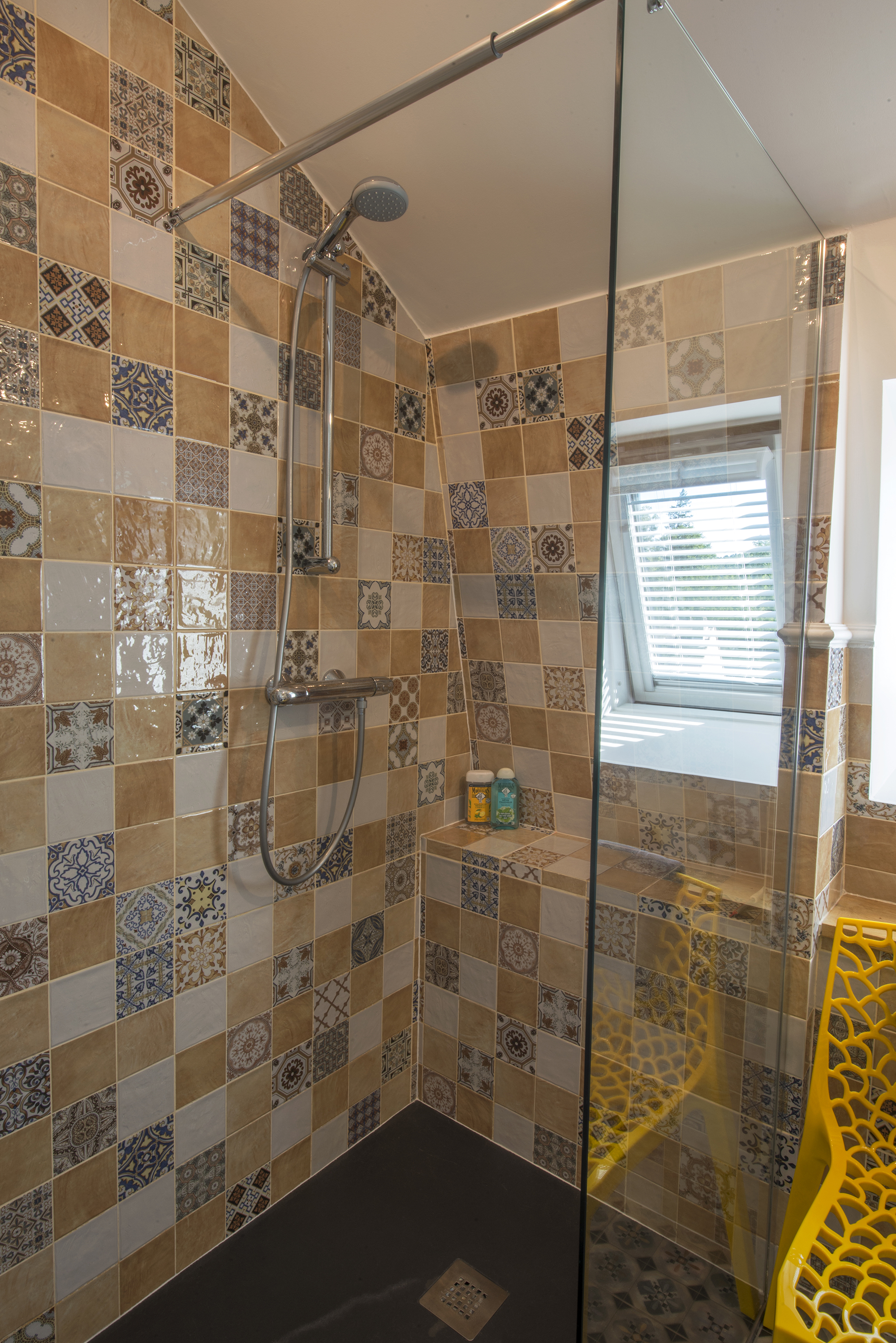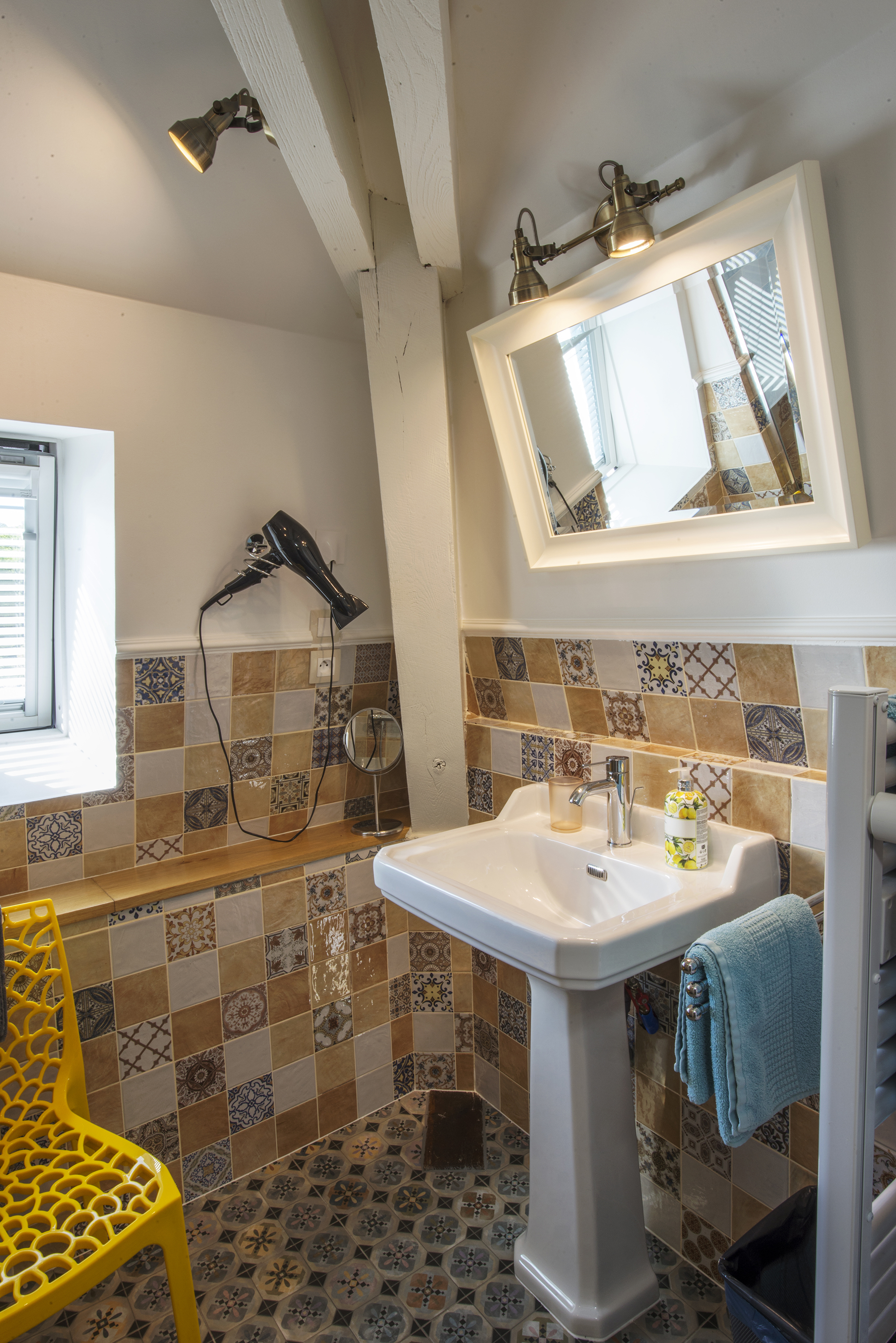 Шампунь, гель для душа, полотенца и фен в душевой.